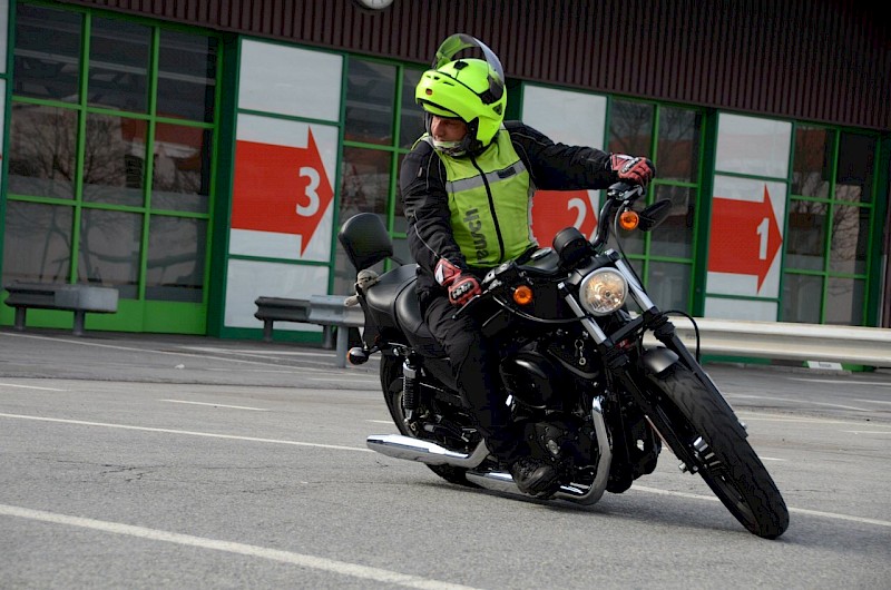 Obiettivi: capire come si inclina un motoveicolo, sperimentare la tecnica per cambiare rapidamente direzione, conoscere la traittoria sicura in curva, sapere scegliere la velocità prima della curva.